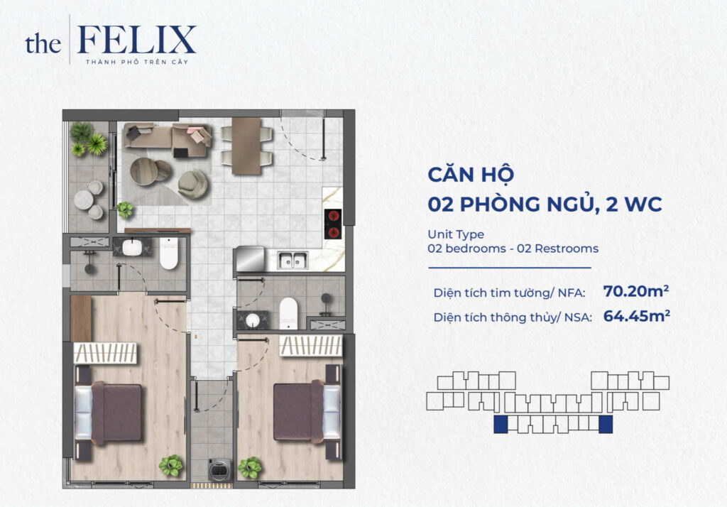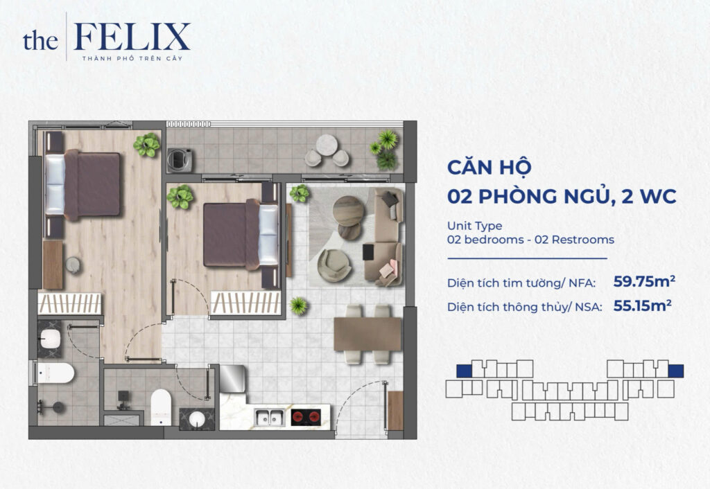 - Căn 2PN: 59.75m² – 61.85m² – 70.20m²