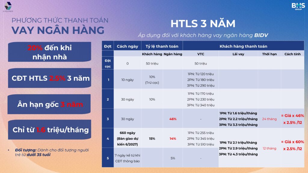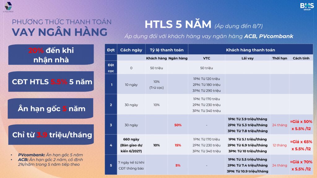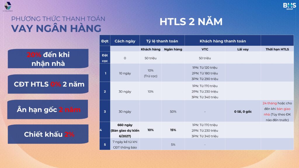 4. Thanh toán 20 % ngưng lại đến nhận nhà (ân hạn nợ gốc & miễn lãi 2 năm)