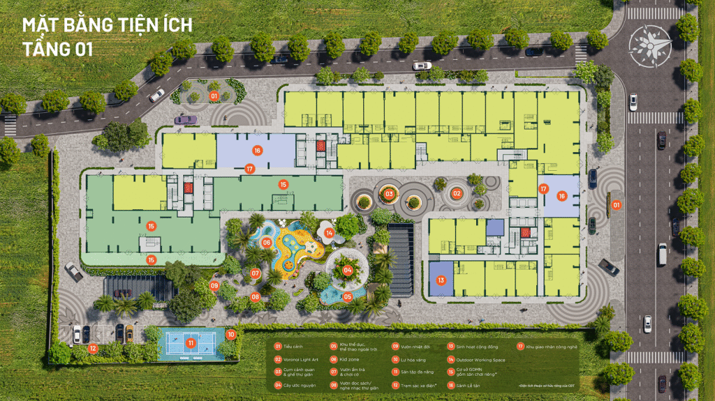 - Tầng 1: Khu tập thể dục thể thao, công viên, vườn đọc sách, vườn nhiệt đới, trường mầm non, sân tập đa năng, coffe, shopping…