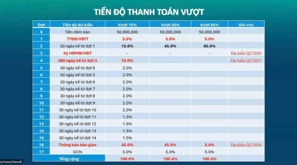 Phương thức thanh toán vượt tiến độ: 15%-45%-85%– chiết khấu: 0.5%-4.5%-12.5%